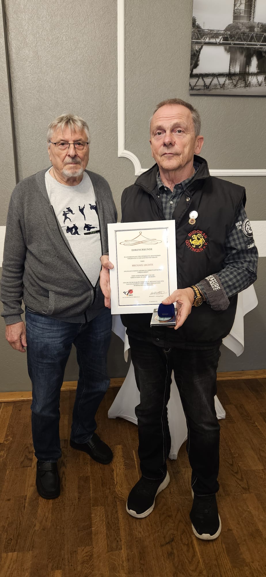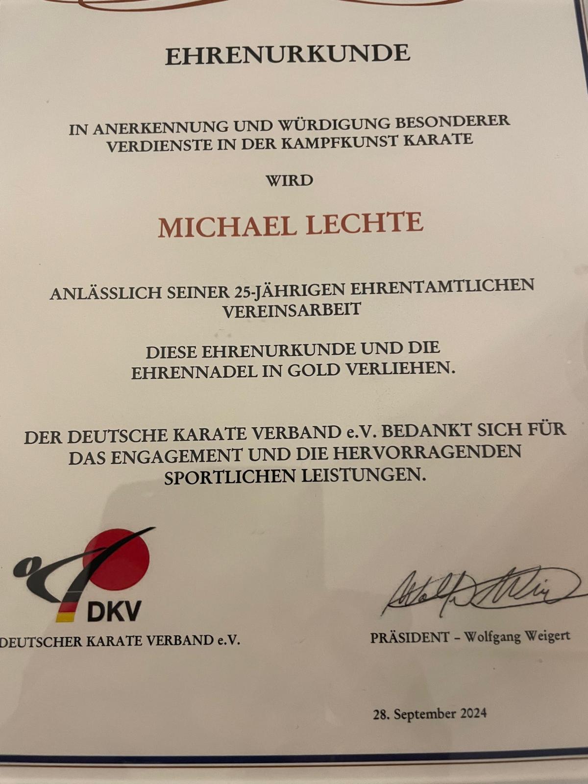 Am 28. September 2024 fand eine besondere Ehrung statt, die Michael Lechte, 8. DAN, als Symbol für seine unermüdliche und leidenschaftliche Arbeit im Dienste des Karate erhielt. In einer bewegenden Zeremonie überreichte Hans Wecks, Träger des 9. DAN und eine bedeutende Persönlichkeit im Koshinkan-Karate, ihm die Ehrennadel in Gold. Diese Auszeichnung ehrt nicht nur seine 25-jährige ehrenamtliche Vereinsarbeit innerhalb des deutschen Karate Verbandes, sondern auch seinen unerschütterlichen Einsatz für die Karate-Community.